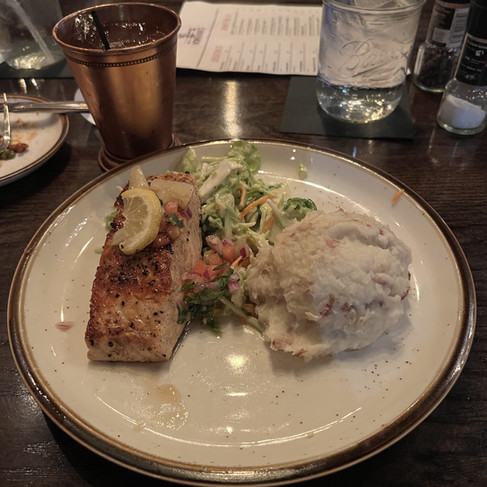 When it came to food, there was no shortage of options. We started with the Sticky Rib Tips. These came out to our table immediately, and they were great. They were covered in N&N BBQ sauce and fell right off the bone. We then ordered our main meals, the Shrimp and Grits Cake, Whiskey Citrus Salmon (what I got), and the Pimento Bacon Burger. The salmon tasted great, probably one of my favorites now. Even though I’m not a huge grits fan, the sauce and the shrimp really made that dish pop with flavor. I wasn’t able to try the burger but was told it was also very good. Looking over the menu as well, there are plenty of options for any dietary restrictions.
