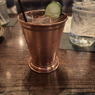 Inside the restaurant, it has pictures on the wall of Greg and Norman, some together and some solo. The atmosphere was amazing for a smaller place and yet it still felt big inside. They had a long bar on the right side and plenty of seating throughout the place. We had a reservation, so we were seated immediately, it doesn’t seem that you need one to eat there though. There was a page from “The Walking Dead” graphic novel sitting above our table, which was really cool also being a fan of the books. Our waiter came to take our drink orders. We got five drinks in total off their cocktail menu: the Kentucky Colada, Reedus Ruffian, Private Johnson, Cucumber Mule, and the Cinnamon Ghost Crunch. All three were unique and tasted good. They have a cocktail for everyone, including non-alcoholic ones, and they also serve beer from a lot of local breweries such as West Sixth and Blue Stallion.
